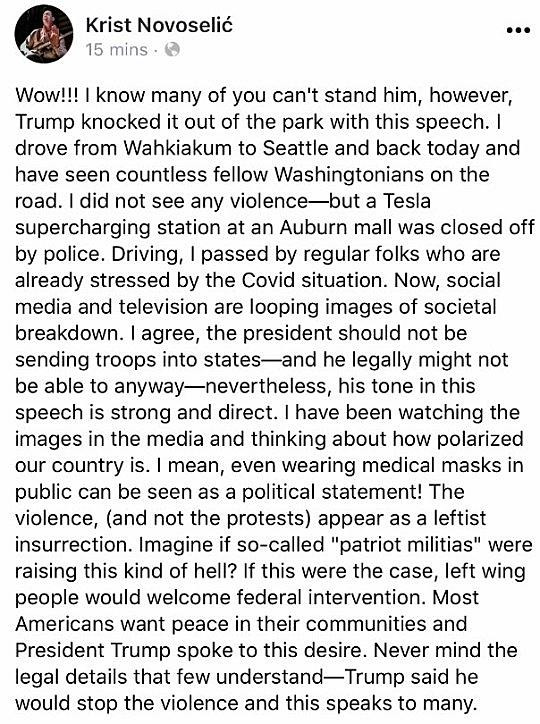 Артист отметил, что если бы «так называемые патриоты-милитаристы» устроили подобные погромы, то люди, которые поддерживают нынешний насильственный протест, потребовали бы вмешательства правительства.